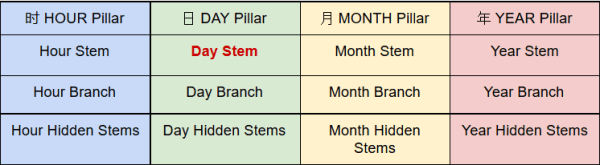 The element of the Day Master (DM) can tell us about the personality of the owner of the chart. Although the DM is important to determine the characteristics, the strength of the other seven elements in the chart (stems and branches) plays a major part in importance. They too, are important to decide the DM’s strength.