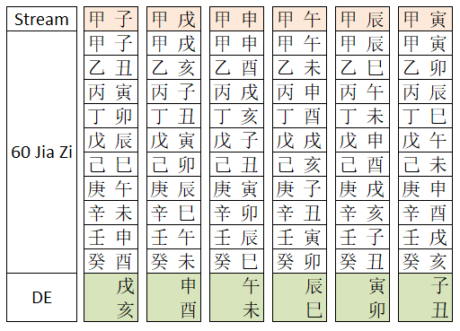 So, if we group each 10 stems starting by Jia, we will have 6 groups. Every group will form 10 pillars (stem+branch) and the remaining 2 branches will be paired by the next group. They are the DE.