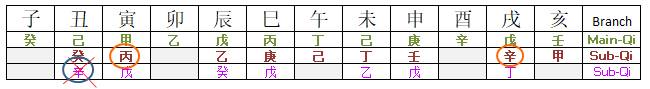 2. just wish to clarify, in your hidden combination, right below the table of those hidden stem, you said 丙+癸, it should be 戊+癸 instead. Consequently, sub-qi (grow)+sub-qi(graveyard) still valid ?